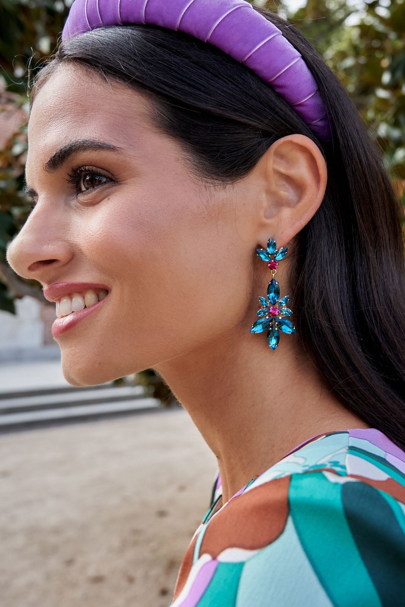 Pendientes de inspiración vintage, elaborados en metal dorado con cristales Swarovski en azul y fucsia. Perfectos para darle el toque espectacular a tu look de invitada.