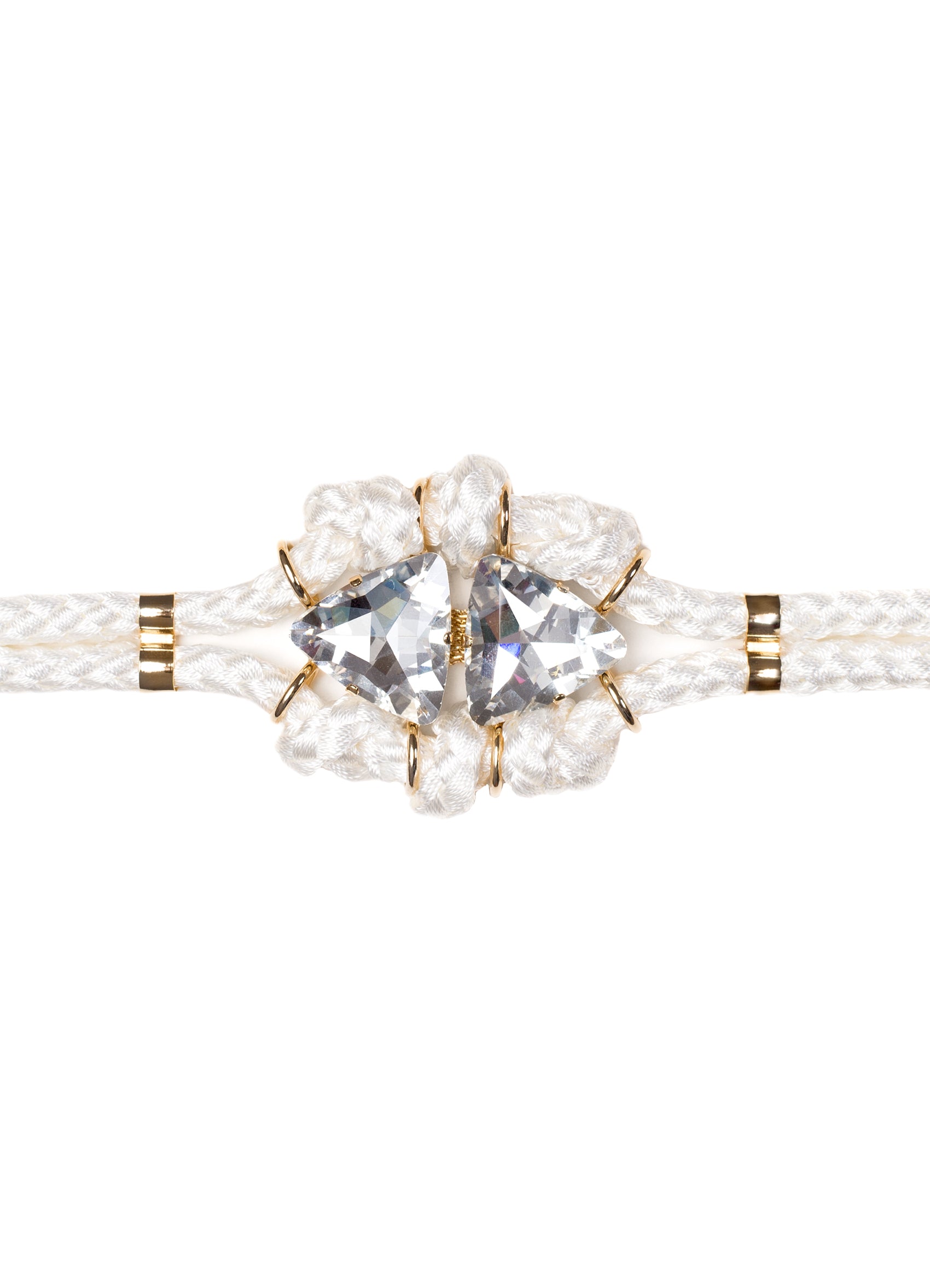 Belt made of white braided silk cord, with gold metal appliqués and double carved Swarovski crystals.