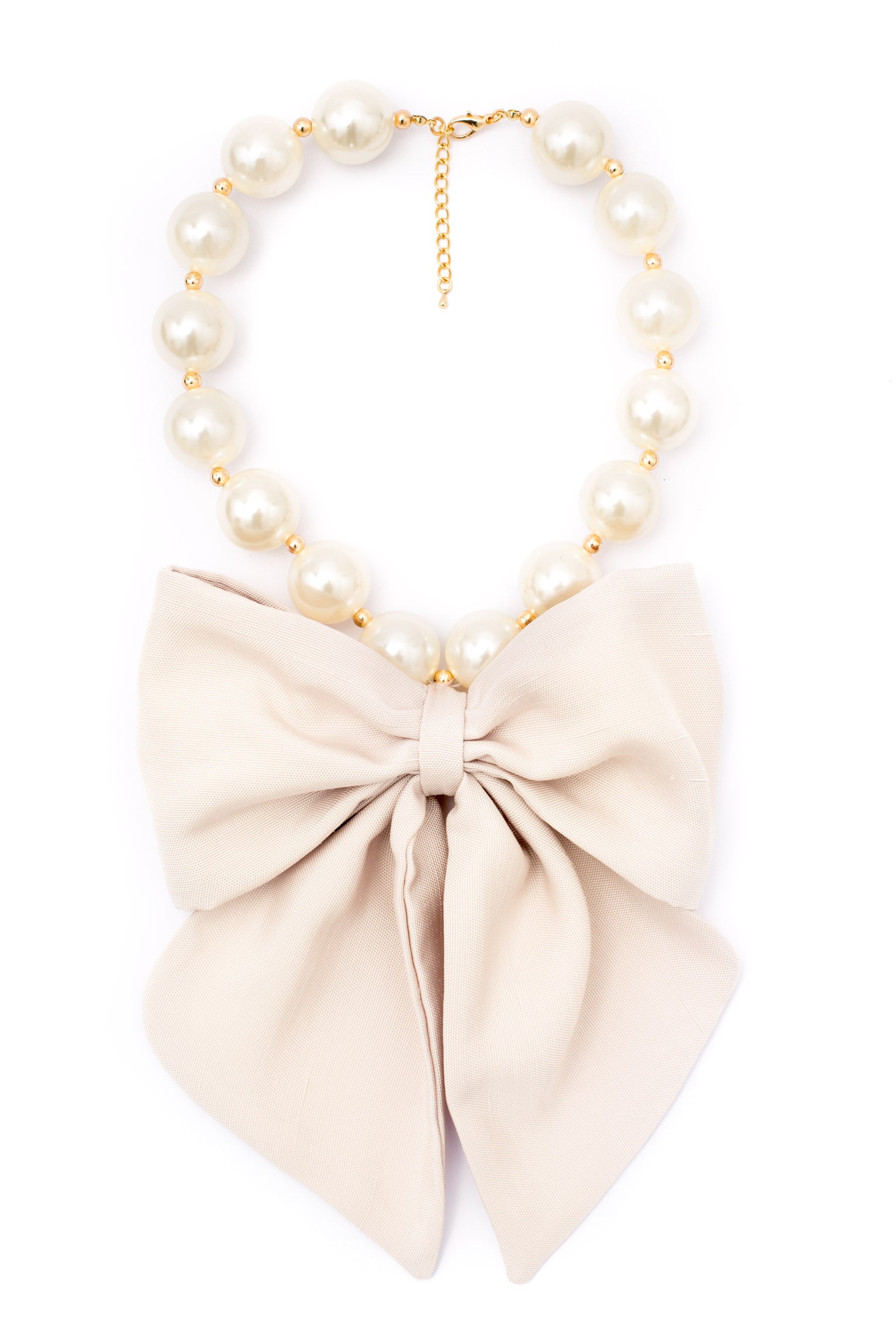 Collar con perlas, bolitas doradas y lazo realizado en tejido.